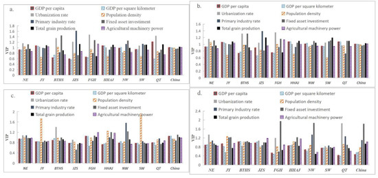 where p is the number of variables X (including GDP per capita, economic density, investment in fixed assets, total grain output, proportion of primary industry, population density, and urbanization rate), m is the total number of potential variables extracted from x, K is the number of response variables Y, is the weight of in each component weight, is the square of the explanatory variance of to dependent variable Y, and VIPj is the measure of the total contribution of Xj to the PLSR model. If the value of VIP is greater than 0.5, it indicates that the independent variable is more important to the dependent variable, and the larger the value of VIP is, the more important it is. VIP calculation in PLSR is implemented in JMP13 software.
