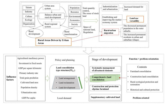 Similarly, the structure and function of land consolidation are mutually constrained. The identification of spatial distribution factors and the driving mechanism analysis of regional temporal change are of great significance to the implementation and function of land consolidation zoning [46]. The object of land consolidation should be changed from “single advance” to “comprehensive elements”, which should not be confined to a single cultivated land, collective construction land, or other single elements to achieve a comprehensive improvement of the seven elements of “mountains, water, fields, roads, forests, villages and cities”. The strategic task of the first stage of our land consolidation is cultivated land protection. Subsequently, farmland remediation with the main purpose of improving the level of farmland infrastructure began to become the main body of land consolidation in China. In 2004, a comprehensive land consolidation in the whole township and village area was carried out, which is the third stage of China’s land consolidation [16,17].