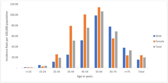 The incidence of cancer per 100,000 population was 19.85 and there was a higher incidence among females (23.91 per 100,000 population) than males (15.69 per 100,000 population). Across all age groups, the incidence of cancer among female was higher compared to males. The highest incidence of cancer (106.51 per 100,000 population) occurred in the age range between 55 and 64 years. The incidence of cancer in the age between 55–64 years was the highest in both sexes (male vs. female, 98.7 vs. 114.17 per 100,000 population, respectively) and the lowest in the under 15 years of age group (male vs. female, 1.30 vs. 1.36 per 100,000 population, respectively) (Figure 1). The highest incidence of cancer was located in Bahir Dar City (95.37 per 100,000), Dangila (46.14 per 100,000), and Gonjii Kollela districts (39.82 per 100,000 population.) The incidence of cases in 2017/18 and 2018/19 was 6.09 and 13.69 per 100,000 population, respectively (Supplementary Data S3).