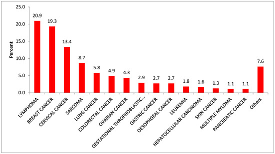 The data show that almost 50% of the patients are in the age range between 35 and 54 years. The first six most frequent cancer types seen at the oncology unit were breast (19.4%) and cervical cancer (12.9%), lymphoma (15.7%), sarcoma (7.3%), colorectal (6.4%), and lung cancer (6.0%) (Table 2 and Figure 2).