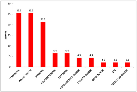 Breast and cervical cancer, lymphoma, ovarian cancer, and sarcoma were the first five most common cancer types among females, whereas lymphoma, sarcoma, lung cancer, colorectal, and leukemia were the first five most common cancers among males (Table 2). We also found that lymphomas (25.5%), Wilms’ tumor (25.2%), and sarcoma (21.1%) were the first three leading types of cancer among children under 14 years of age (Figure 3). More than 96% of cancer patients came from 56 districts, of which the highest (17.7%) came from Bahir Dar city administration. Nearly two-thirds of the cases came from 15 districts (Bahir Dar city administration, Mecha, Adet, Achefer, Dangila, Fogera, Dera, Jabitenan, Gonj Kollela, Buire Womeberma, Este, Hullet Ejuensie, Bahir Dar Zuriya, and LivoKemekem districts (Figure 4).