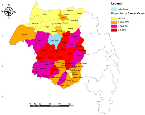 For the first time, we describe, in detail, the epidemiologic characteristics of cancer patients enrolled at Felege Hiwot Hospital using spatial analysis, providing policymakers and healthcare providers with critical information for patient management and regional cancer response planning. Existing cancer treatment centers are not equitable, as many cancer patients living in rural districts travel long distances to access services. The study also helps the clinical practitioner to plan counseling interventions in line with clinical interventions by nearby health facilities for rural cancer patients. The identified districts with a high proportion of cancer cases should receive priority attention from public health planners for the allocation of scarce resources and to devise interventions. The promotion of a healthy lifestyle; awareness creation; early diagnosis and treatment of cancer; and the further identification of risk factors related to genetics, environment, and occupation are the areas of further research and intervention.