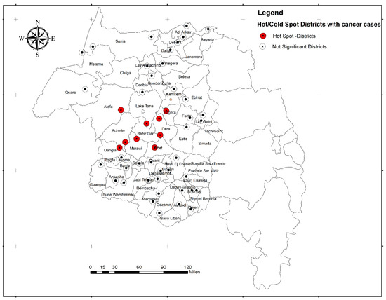 Hot spot districts with high number of cancer cases, Amhara region, Ethiopia, 2019.
