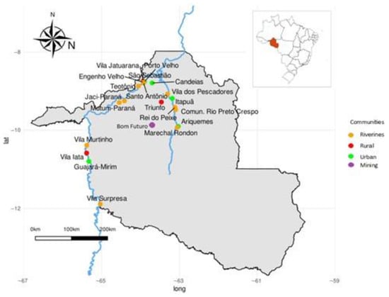This longitudinal cohort study with a quantitative and analytical approach evaluated 1433 women of reproductive age who lived in the area covered by the Jamari, Madeira and Mamoré rivers, in the Rondônia State, Brazilian Amazon. All women who were pregnant between 2006 and 2007 were invited to participate in the study. We invited 1668 pregnant mothers; 215 women dropped out within the first semester of the study and 20 during the first year. In the subsequent evaluations, there were no dropouts. All women who agreed to participate were selected according to the following criteria: healthy women during pregnancy, absence of congenital malformations, and residing for at least five years in the study area. Participants were classified as groups of interest derived from rural, urban, riverine and mining areas, according to their place of residence (community). The mining area is located in Bom Futuro, on the banks of the Jamari River, affluent of the Madeira River. It is legal mining, extracting tin from cassiterite, and its activity does not result in any direct Hg emission; it was included in the sampling because it is an important economic activity of the region. Figure 1 shows the study area, which covers more than 733 km along the Madeira River basin and tributaries.