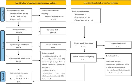 A total of 887 articles were found on PubMed and Web of Science. Of these, 137 were duplicates, resulting in 750 articles to be verified for eligibility. After reading the titles and abstracts, 500 studies were excluded, and 250 studies were read in full. Fourteen studies were included in this review because they met the eligibility criteria, and after reading their references, one additional study was included, resulting in fifteen articles. The article selection process is presented in Figure 1.