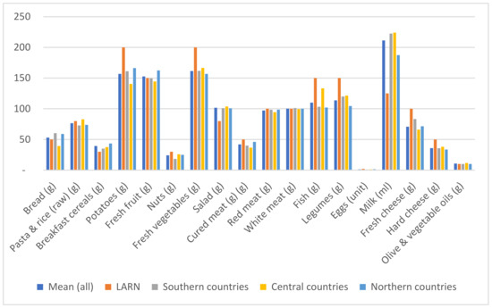 Mean portion sizes in the considered countries (overall mean; Southern, Central, and Northern countries) and reference standard portions defined by the Italian Society of Human Nutrition (LARNs, “Reference intake levels of Nutrients and energy for the Italian population”) [3].