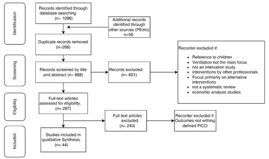 The following electronic databases were consulted: Scopus—481 results; Web of Science—406 results; Joanna Briggs Institute Database of Systematic Reviews and Implementation Reports—0 results; CINAHL Complete (EBSCO), CINAHL Plus with Full Text, MedicLatina, MEDLINE with Full Text, MEDLINE, and ERIC—202 results; and Cochrane Database of Systematic Reviews, Database of Abstracts of Reviews of Effects, PubMed, and Embase—9 results. The keywords are described in Supplementary S1 (database search terms). An additional search was done in the PEDro database—56 results, with the keywords “respiratory therapy”, “impaired ventilation”, and “systematic review”.
