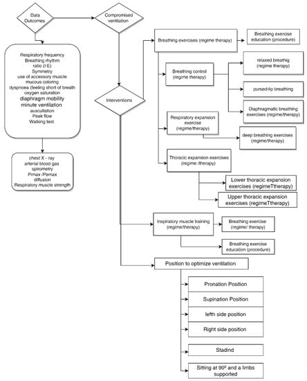 Preliminary research on the data banks JBI for Systematic Reviews and Implementation Reports, Cochrane, PROSPERO, PubMed, and CINAHL concluded that no umbrella reviews have been performed and that no progress has occurred for this subject. Therefore, this revision is relevant to discovering the best possible evidence; evaluating its quality; providing the state-of-the-art knowledge on the effectiveness of the nursing interventions in the ventilatory domain, namely, “training of the respiratory muscle”, “execution of techniques of breathing control”, “execution of positioning techniques”, and “execution of thoracic expansion techniques”; and mapping all the nursing interventions related to impaired ventilation.
