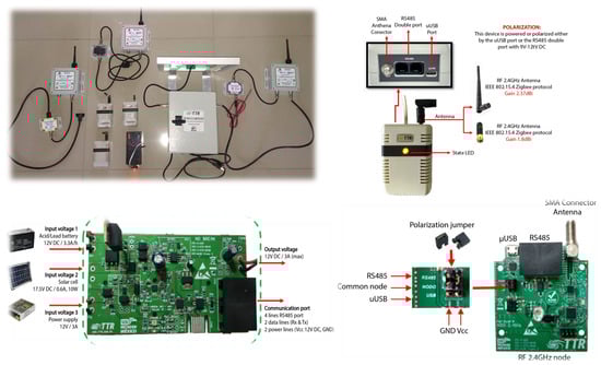 The distributed sensor network comprises a concentrator or coordinator node (circuit found on the right of Figure 1) connected to a computer via USB, which manages all the information transmitted and received by the network. Additionally, there are three router/sensor nodes (circuit on the left of Figure 1) that can be used to connect various sensors measuring parameters such as temperature, pressure, humidity, infrared presence, light and sound. These router/sensor nodes transmit data to the concentrator node via radio frequency and they can also act as signal repeaters. The router nodes are equipped with the IEEE 802.15.4 communication protocol and operate on the 2.4 GHz band. They can function as sensor nodes with various sensor devices for physical variables or act as repeaters for data received from other nodes. Although the hardware and number of ports of these nodes are identical, it is useful to differentiate them with labels to locate them better in the physical and logical network organization.