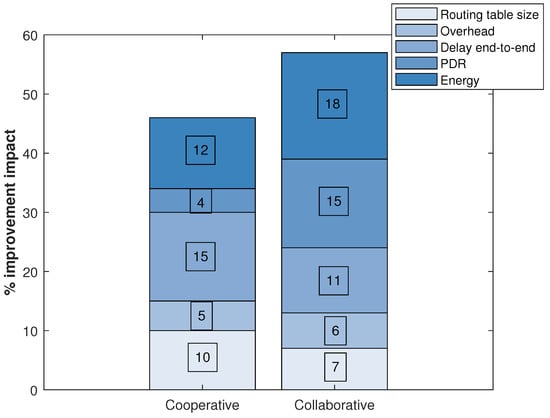 The impact described in Figure 2 shows the difference in each specified metric between the network in a stable state without any technique (neither cooperation nor collaboration) and the network in a stable state with one of the two techniques applied. In this case, with the impact, we refer to each technique’s improvement. The metrics taken into account are related to the performance of the sensor network. So, for example, the size of the routing tables influences the number of entries a node has to send packets. It is related to the number of valid routes and the effort the routing algorithm has to make to find the next hop to a destination route. The overhead refers to the control packets, that is, to the packets that flood the network for management of the routing protocol. These packets, if there are too many, can generate more collisions than necessary because the network also has traffic packets, which are the ones that carry the information. The end-to-end delay is the delay that a packet takes from the source to the final destination. The Packet Delivery Ratio (PDR) is the rate of packets that reach the destination. It is the ratio between packets received and packets sent. Finally, the energy is given in Joules, which the node spends on the main network tasks such as turning on, turning off, route processing algorithm, changing state, transmitting and sending packets and listening to the channel.