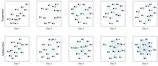 Figure 3 shows the logical topology change over five days. This change is outlined for each scheme studied. We observe that, under the cooperative scheme, the network shows fewer links (30% approximately) concerning the collaborative scheme. In both cases, the system increases the number of logical links per node as the days go by. This is because the algorithm knows more routes, which have a lifetime in the routing table. Some of them are still valid and others have become obsolete. The greater the number of links (routes), the greater the redundancy and congestion. However, protocol management and the number of control packets can lead to more collisions. With fewer links in the nodes, the information delay and the network’s power consumption can decrease.
