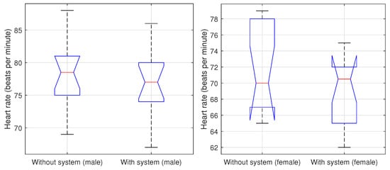 We then found that, apparently, for women, the monitoring system represents a kind of greater peace of mind by 4% when they are under the presence of the monitoring system. Concerning men, this difference is only 2%. For both cases, in the presence of the sensor system, the heart rate numbers decrease for both genders.