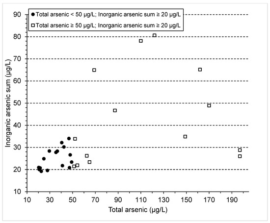 Urinary inorganic arsenic levels (µg/L) are plotted against total urinary arsenic (µg/L) for EBEST participants with elevated inorganic arsenic levels (n = 30). The filled circles represent participants’ urine samples with total urinary arsenic <50 µg/L and inorganic arsenic ≥20 µg/L. The unfilled squares represent participants’ urine samples with total urinary arsenic ≥50 µg/L and inorganic arsenic ≥20 µg/L.