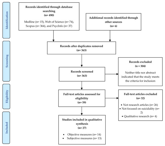 Exclusion criteria were, as follows: (1) be articles with non-empirical designs (e.g., case reports, reviews, book chapters, opinion letters, commentaries, conference papers or meeting abstracts); (2) be written in other languages apart from English, Spanish or Catalan; (3) be performed in vitro or in animals; (4) focus on other exposures (e.g., having read the book on which 13RW is based, or watched any other show related to the issue, but not specifically 13RW); (5) analyze other effects in the field of mental health, but not specifically suicidality (e.g., depression, anxiety or resiliency); and (6) express results in qualitative terms.