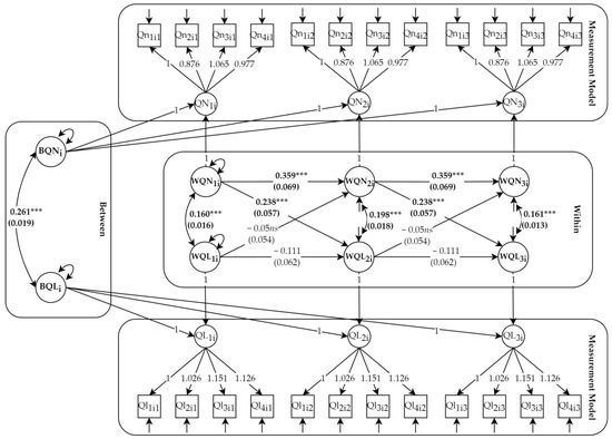 The results of the random-intercepts cross-lagged panel model with standardised path coefficients. Note: *** p < 0.001; QNti—latent quantitative job insecurity; QLti—latent qualitative job insecurity; BQNi—random intercept for quantitative job insecurity; BQLi—random intercept for qualitative job insecurity; WQNti—within-person fluctuations in quantitative job insecurity; WQLti—within-person fluctuations in qualitative job insecurity. The graphical representation of the research model is based on the article by Mulder and Hamaker [55].