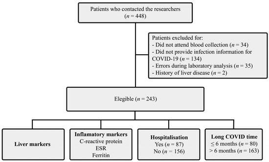 The study participants were selected through convenience sampling from those included in the Long COVID-19 Program in the Brazilian Eastern Amazon between March 2020 and December 2021. A total of 448 adult patients of both sexes, aged 18 years or older, who were not using hepatoprotective or anti-inflammatory drugs during the study, diagnosed with COVID-19 using reverse transcriptase polymerase chain reaction, and who developed at least one long-term symptom related to COVID-19, such as cough, dyspnoea, chest pain, muscle weakness, loss of balance, tremor, fatigue, muscle pain, headache, visual disturbances, insomnia, and/or lower limb oedema, not attributable to another differential diagnosis, for at least 4 weeks after the onset of symptoms, were selected. Of these patients, 134 with incomplete data, who did not undergo blood sample collection (n = 34), with incomplete data on laboratory analysis results (n = 35), and with history of previous liver disease, including chronic hepatitis B/C virus infection (n = 2), were excluded. Thus, only 243 patients were eligible for this study. For data comparison, the patients were allocated into the following groups: (i) long duration of COVID-19 (≤6 months, n = 80; >6 months, n = 163), (ii) hospitalisation (yes, n = 87; no, n = 156), (iii) inflammatory markers (all tests were performed for all patients, n = 243), and (iv) liver injury markers (all tests were performed for all patients, n = 243) (Figure 1). The total, direct, and indirect bilirubin and albumin tests were only performed on 94 patients.