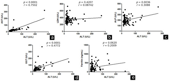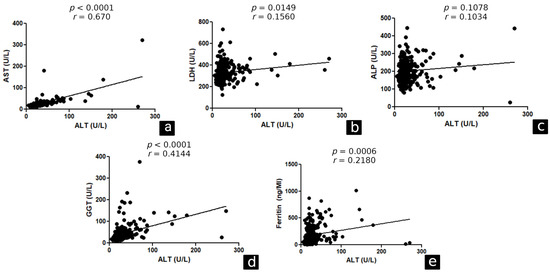 Correlation analysis was performed between ALT and AST (p < 0.0001, r = 0.670), LDH (p = 0.0149, r = 0.1560), GGT (p < 0.0001, r = 0.4144), and ferritin (p = 0.0006, r = 0.2180) levels in the general study population (Figure 2). In hospitalised patients, a correlation was found between ALT and AST (p < 0.0001, r = 0.7502), ALP (p = 0.0036, r = 0.3088) and GGT (p < 0.0001, r = 0.4772). The other correlations are shown in Figure 3.
