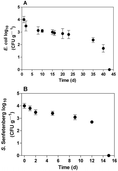 Similar results were observed after applying livestock manure to soil, where E. coli O157:H7 and Salmonella persisted in the soil for up to one month after its application to both sandy and clayey grassland soils [45]. Studies on the soil application of swine manure revealed that after the 20th day, the quantity of bacteria decreased very slowly, independent of the amount of sludge used, such that after 80 days, an estimated concentration of 103 CFU dry matter−1 remained in the soil [46]. The estimated average time required to obtain undetectable E. coli concentrations in sandy soil ranged from 56 to 70 days [47].