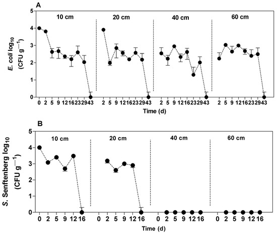 As shown in Figure 2A, E. coli was found up to a depth of 60 cm 48 h after swine manure application, most likely due to fertilizer drag. There was a significant reduction (p < 0.05) in the first five days at soil depths of 10 cm and 20 cm. E. coli strains remained viable in the soil column, similar to the survival results depicted in Figure 1A. S. senftemberg (Figure 2B) did not penetrate the deepest soil layers, reaching only a depth of 20 cm. There was a significant decrease in the S. senftemberg concentration in the layers of soil (10 and 20 cm) in the first 48 h and a reduction to zero by the 16th day after swine manure application (p < 0.05).