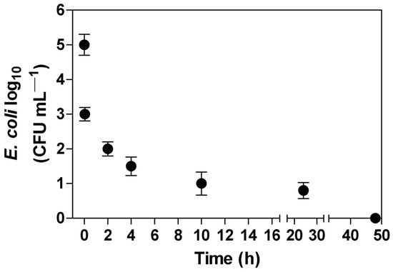 Rain can promote the survival of pathogenic bacteria by keeping the soil wet, and it can also move bacteria through the soil to more or less suitable areas, as well as potentially contaminate groundwater [65]. Figure 3 shows the behavior of E. coli in clayey soil fertilized with swine manure exposed to rain. The samples obtained in this phase of the study were not from soil, but from the liquid fraction (leachate) that exceeded 60 cm of the soil column, simulating rains on swine-manure-fertilized soil. As a result, after 5 min of rain, approximately 103 CFU reached a depth of 60 cm, and after 48 h, all water had percolated and the total bacteria concentration was reduced. This result indicates that the bacteria leaching in the first 24 h and the water eliminated in the last 24 h correspond to the water retained in the soil particles.