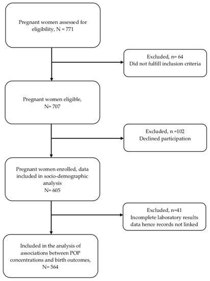 The inclusion criteria included all pregnant women who were in the late stages of their pregnancy; 16 years of age and above; permanent residents of the Blantyre, Chiradzulu and Thyolo districts; and willing to voluntarily sign an informed consent statement. All women with serious medical conditions present at the time of enrolment, high risk pregnancies with prognoses to be referred to a tertiary health care level, or were also participating in another study were excluded. In this regard, a total of 771 pregnant women were assessed for eligibility and 605 were recruited for the study. However, only 564 women–neonate pairs were included in the final study population for statistical analysis on the associations between POP concentrations, as 41 either declined to have their biological sample collected, or the volume of the sample was insufficient. Figure 1 describes the details of the number of participants assessed for inclusion and recruited.