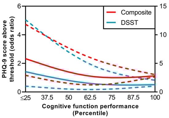 Logistic relationship between cognitive function and depression in older (≥60) US adults after adjustment for sociodemographic factors and medical history in terms of self-reported chronic condition and incidence of stroke or memory–cognitive function loss. Cognitive function was expressed as a composite score and on a test-by-test basis based on the Consortium to Establish a Registry for Alzheimer’s Disease Word List Learning Test, the Word List Recall Test, the Intrusion Word Count Test, the Animal Fluency Test, and the Digit Symbol Substitution Test. Depression was defined as clinically significant depression symptoms based on the standard cut-off point of Patient Health Questionnaire-9 (PHQ-9) score of 10 or greater. Significant associations between cognitive function including its components and depression symptoms are shown. Solid lines represent the estimated odds ratio and the area bound by the dashed lines represents the 95% confidence interval. Cubic splines with three knots were used for modelling. The highest quartile of cognitive performance and PHQ-9 score above threshold were used as the reference.