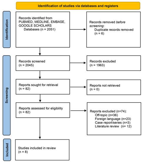 The articles’ initial identification, eligibility and inclusion process was described in Figure 1. The scientific paper list included a total of 2051 manuscripts, and six duplicates have been removed. After the title and abstract evaluation, a total of 1963 manuscripts were excluded after the screening phase and 82 papers were included for the full-text evaluation. A total of 74 full-text papers was excluded: 36 off topic articles, 23 papers written in a non-English language, three case reports/series, and 12 literature reviews. A total of eight papers were included for qualitative synthesis and meta-analysis assessment.
