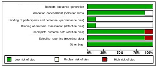 The risk of bias findings are reported in Figure 2 and Figure 3. The most recurrent parameters were performance and detection biases, with a high percentage of uncleared risk (>75%), followed by the reporting and attrition biases. The study of Lourenço-Queiroz et al. [8] was the only randomized clinical trial (RCT) that reported the maximum score of 7/7 risk of bias assessment (Figure 3). According to previously described methods, the low-risk studies were included for further network meta-analysis approaches [8,9,10,11,12].