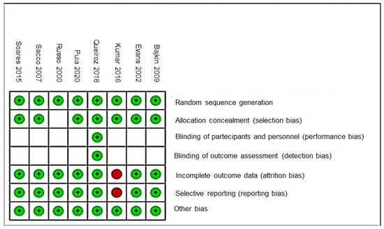 Risk of bias summary about each risk of bias item for each included study (green dot: low risk of bias; red dot: high risk of bias) [8,9,10,11,12,13,14,15].