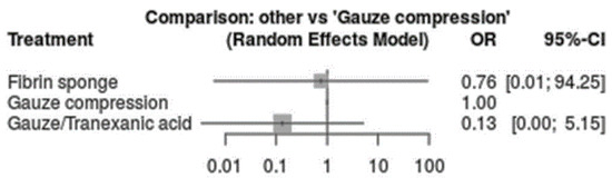 A pragmatic computational model was adopted for the network meta-analysis concerning Owen et al.’s previously described method [7]. A network model concerned the relative risk of three different haemostatic agent approaches: gauze compression, gauze/tranexamic acid, and fibrin sponge being applied [8,9]. In another instance, a second network model was adopted concerning pharmacological therapy management: full coumarins (full-CU) dosage, reduced coumarins (low-CU) dosage, 2 days suspension (2-DSu), and low-weight heparin (Hep) [10,11,12].