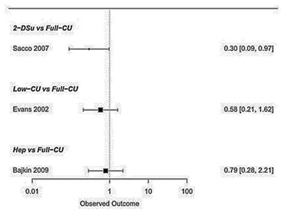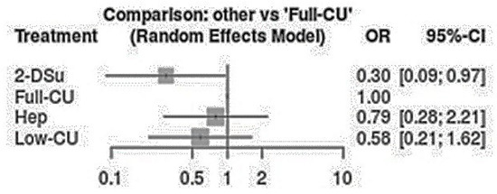 Regarding the haemostatic agents, the 2 day cumarins suspension showed a significantly lower risk of bleeding compared to the continuous cumarins full therapy (p < 0.05) [OR: 0.30; 95%CI: 0.09–0.97]. Similar findings were detected between the low-dosage vs. continuous cumarins full therapy (p > 0.05) [OR: 0.58; 95%CI: 0.21–1.62] (Figure 4, Figure 5 and Figure 6). No significant differences were detected between low-molecular-weight heparin vs. continuous cumarins (p > 0.05) [OR: 0.79; 95%CI: 0.28–2.21].