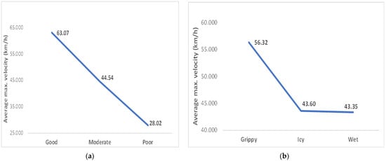 In reference to the environmental conditions, the ANOVA test showed how the mean maximum velocity significantly differed between the categories that make up the variable visibility. Indeed, when compared good with moderate and poor visibility, the mean maximum velocity decreased by 18.5 and 35 km/h, respectively. However, this was not entirely the case for the quality of snow because, although the statistical significance of the mean differences for comparisons to grippy snow was less than the given significance level, between the categories of icy and wet snow, the latter was very close to the unity.