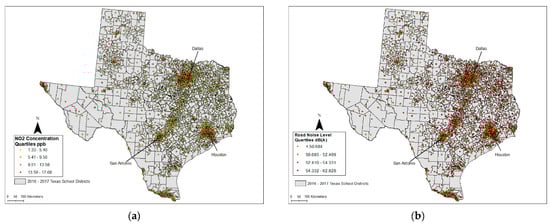 The spatial distributions of the two dependent variables are shown in Figure 1, where all Texas public schools are grouped into four quartiles based on their respective values of NO2 concentrations (Figure 1a) and road noise (Figure 1b). Tracts in the highest quartile (top 25%) for both NO2 and noise exposure are located mainly within or adjacent to the three largest metropolitan areas (Dallas, Houston, and San Antonio) and along interstate highways that connect these areas. In contrast, schools in the lowest quartile (bottom 25%) for both dependent variables can be observed mainly in rural districts with fewer schools. However, a large proportion of schools in the highest quartile of road noise exposure are also located along secondary highways that intersect smaller metropolitan areas (e.g., Austin, Beaumont, and Lubbock) of Texas.
