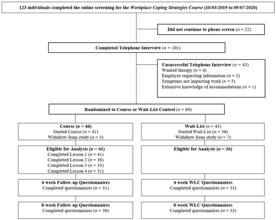 The study used a randomized controlled trial design with an 8-week follow-up to examine the efficacy of the WCSC relative to WLC for Canadian employees who self-reported anxiety and/or depression symptoms. An 8-week timeline was chosen as it was believed this was an adequate amount of time to request accommodations and for improvements to be assessed. The course was offered via the Online Therapy Unit at the University of Regina which delivers various internet-delivered mental health treatment programs. The present study, which ran from October 2019 until September 2020, proceeded after institutional ethics approval and trial registration (Clinical Trials.gov ID: NCT04122482).