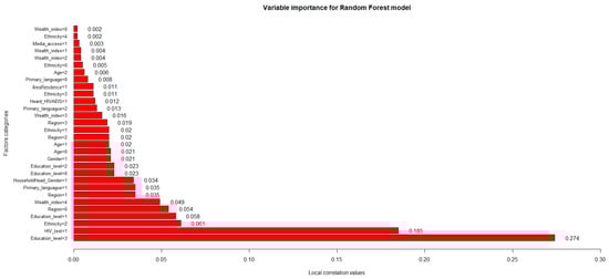 Once a set of influential characteristics has been identified, the next step is to summarize the functional relationship between each characteristic, or subset thereof, and the outcome of interest [57]. For such work, the local correlation value will be used to specify the role of each attribute in the prediction of a response variable and thus generate a relevance ranking of the factors considered, with positive values indicating that the attribute supports the correct predictions and negative values suggesting that the feature contradicts them [58]. Those levels that exceed this value (> 0.01) will be considered as empirically positive [58], thus specifying that these support positive predictions in the observations related to the level of adequate knowledge about HIV/AIDS in adolescents and young adults in Peru.
