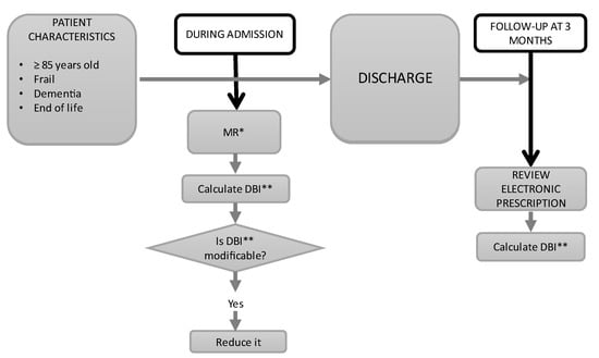 - Masnoon, N.; Lo, S.; Hilmer, S. A stewardship program to facilitate anticholinergic and sedative medication deprescribing using the drug burden index in electronic medical records. Br. J. Clin. Pharmacol. 2023, 89, 687–698. [Google Scholar] [CrossRef] [PubMed]