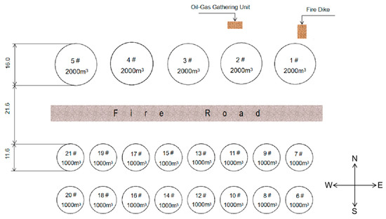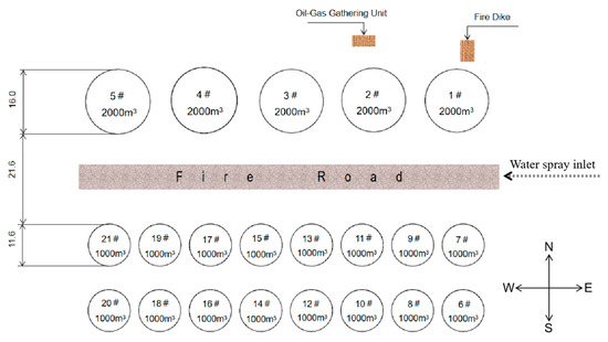 There are 21 storage tanks (three rows from north to south) in the accidental tank farm. In the first row, there are five 2000 m3 storage tanks labeled with 1# to 5# from east to west, which store about 9100 tons of materials. The second row contains eight 1000 m3 storage tanks, all of which are empty. In the third row, there are eight 1000 m3 storage tanks, among which tank 6# in the southeast corner stores about 889 tons of materials. The layout of the tank farm is shown in Figure 1.