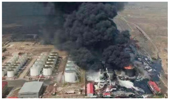 The cause of the accident was illegal hot work and failure to install a flame arrester and shut-off valve in the oil vapor recovery line, which ignited the combustible gas in the tank. The accident site is shown in Figure 2 and Figure 3. In the early stage of the accident, firefighters focused on extinguishing and cooling tanks 1# and 2#–5#. The tanks on the south side were not protected and were also in danger due to thermal radiation.