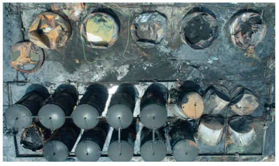 As shown in Figure 24, when the cooling water intensity increased to 6 L/min·m2, the temperature of the tank farm was significantly decreased. Most of the tanks’ temperature was below 620 K, and the highest temperature was 779 K in tanks 7# and 9#, which is 653 K lower than that without water curtain protection. When the cooling water intensity increased from 2 to 6 L/min·m2, the highest temperature in the tank farm decreased from 1377 to 779 K, and the cooling protection effect was very obvious.