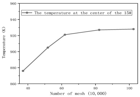 In this paper, five different grid numbers were established for the independent grid study [20], and the number of cells was 371 thousand, 518 thousand, 619 thousand, 822 thousand and 1.025 million, respectively. The initial attributes of each parameter were as follows: the pressure was set as standard atmospheric pressure; temperature 290 K; the ambient air inlet and fuel inlet were 4 m/s. The ambient air inlet consists of nitrogen 0.79 and oxygen 0.21. For the sake of simplification, the fuel inlet was assumed to be methane with a ratio of 1. The outlet was set as the pressure outlet; the remaining boundaries were set to the walls. The temperature at the center point of tank 15# was monitored when the simulated accident occurred in 120 s, and the results are shown in Figure 6. The results show that the temperature does not change significantly as the number of meshes increases and gradually stabilizes. At the same time, an increase in the number of grids results in an increase in computational time. Accordingly, 822 thousand grids were chosen as the grid-independent solution for this simulation, taking into account both accuracy and cost.