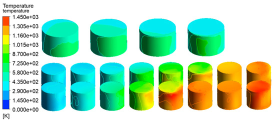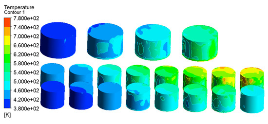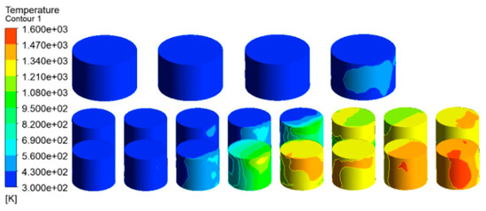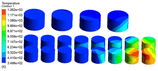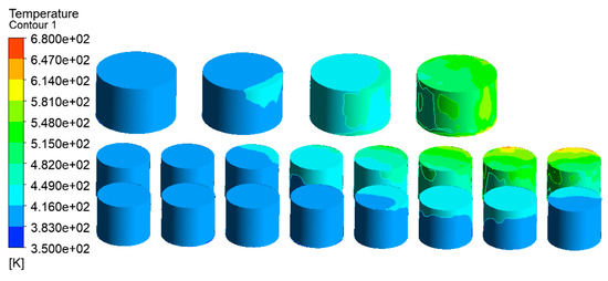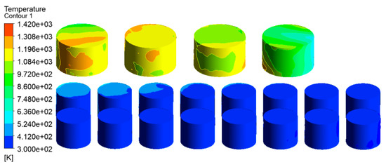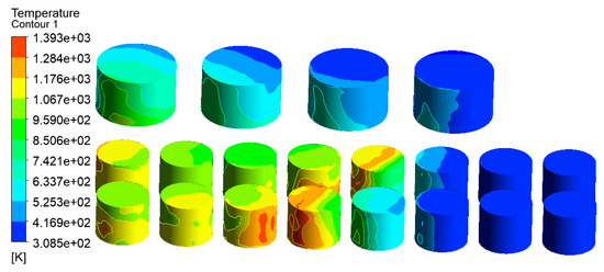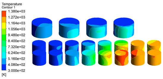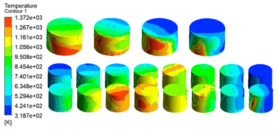 The 19° east by north wind (Figure 15) and the simulated wind direction in Section 4.1 had a similar influence on the tank farm. The difference was that the affected tanks were different. For the two wind directions, tanks 13# and 14# were both affected, with temperatures exceeding 870 K. As shown in Figure 16, the temperatures of tanks 13#–21# were relatively high, which was in the downward direction of the wind. Accordingly, sufficient oxygen was provided to make the fuel burn more sufficiently. At the same time, these tanks (13#–21#) prevented the combustion gas from moving towards the southwest direction, forcing the gas to move towards the north, resulting in the temperature increase in tanks 4# and 5#.