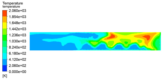 The temperature distribution of the tanks in the tank farm was analyzed using the CFD-Post 2020R1 software, as shown in Figure 7. The tanks 1#, 6#–14#, which were located downwind of the accident tank, were most affected by the fire. The highest temperature of the tanks could reach 1432 K. Under this extremely high temperature, an explosion would probably occur, and secondary accidents would result in more serious consequences in the tank farm. Tanks 15#–21# were least affected by the thermal radiation of the accident tank. Compared with tanks 6#–14#, the temperatures of tanks 15#–21# were lower, which made it easier to not cause serious consequences, such as rupture or failure. The combustion temperature of hydrocarbon combustion reached 2060 K, which appeared at the south exit, as shown in Figure 8. Therefore, the potentially catastrophic consequences need to be paid more attention due to the severely high local temperatures.