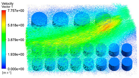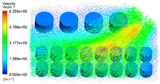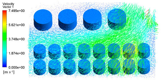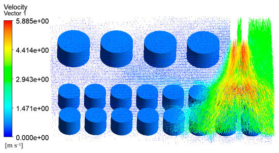 The velocity vector of the tank farm air–fluid domain is shown in Figure 9. It can be seen that the wind speed on the empty fire road was higher, and the tank wall’s temperature near the fire road was also higher. At the same time, the gas flow speed across the gap between the tanks such as 1#, 6#–14# will also increase. The tank wall’s temperature in these areas was also higher than that of the other tanks.