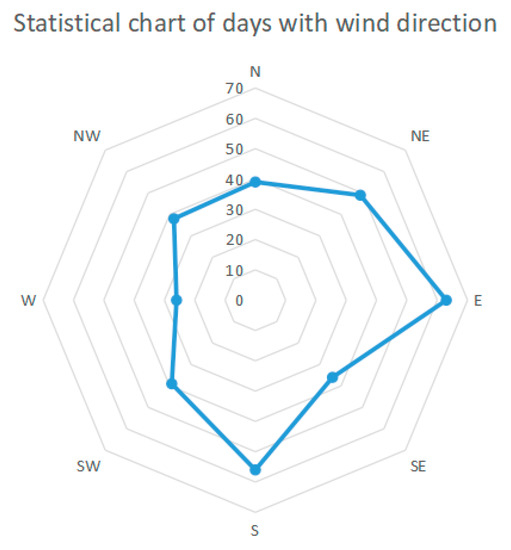 Wind direction plays a crucial role in the spread of the fire. The fire occurred in tank 1#, which was located northeast of the tank farm. Therefore, east, north and northeast winds can affect the tank farm. According to the local meteorological record in 2021, a total of 346 days of weather conditions were recorded. The statistical results are shown in Figure 12, and 151 days of wind directions are east, north and northeast, respectively.