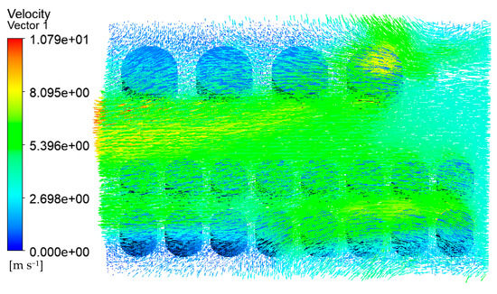 Velocity vector diagram of the air–fluid domain in the north wind tank area.