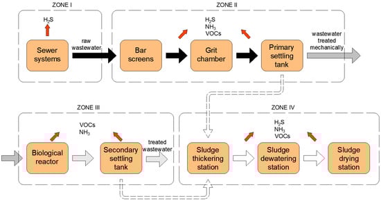 At the wastewater treatment plant itself, two process lines (wastewater and sludge) are distinguished, within which three more zones can be separated, where odours hazardous to health are emitted (Figure 1) [].