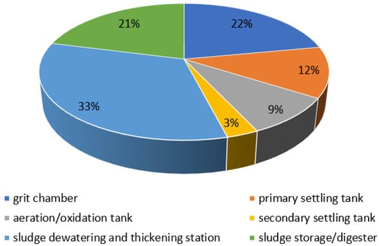 Equipment included in the fourth zone, including gravity thickeners, aerobic stabilisation chambers, separate digesters, dewatering equipment, and station facilities, is characterised by significant odour emissions. Thickening, dewatering, stabilisation, and hygienisation processes are identified as a significant and the most serious source of odour release from municipal management facilities. According to a study by Gębicki et al. [], almost 37% of the distribution of odour emissions from wastewater treatment plants comes from sludge treatment processes. The thickening of sewage sludge produces volatile fatty acids. In turn, nuisance odour in the hygienisation process is caused by high ammonia emissions. For the hygienisation process, quicklime (CaO) or slaked Ca(OH)2 is used, and its oxide form (CaO), after the formation of calcium sulphate, results in the effective reduction of sulphur-containing odour emissions []. During the stabilisation process, the amount of organic matter is reduced as aerobic or anaerobic decomposition takes place, the overall level of microorganisms increases, and pathogenic microorganisms are reduced. As a result of this process, the amount of substances hazardous to the environment is reduced, including odour-causing compounds. Different approaches to technical solutions in wastewater treatment plants in terms of the conditions of the stabilisation process can affect the different contents of odorous substances in sludge after the stabilisation process []. According to Senatore et al. [], the sludge section is the main source of odour emissions. The average percentage distribution of odour emissions is 21% for the sludge storage station, while as much as 33% is attributed to the sludge dewatering and thickening station (Figure 2).