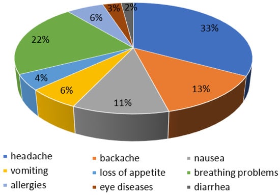 Long-term human exposure to odorants can cause negative health effects, beginning with emotional ones, such as anxiety, depression or restlessness, and ending with physical symptoms, which include eye irritation, headache, respiratory problems, nausea and vomiting (Figure 3) []. Table 2 shows the characteristics of selected odorants and their effects on the human body and the environment.