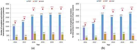 Number of complaints and requests investigated by PIEP and CIEP in the field of: (a) air protection; (b) odour nuisance (own elaboration based on []).