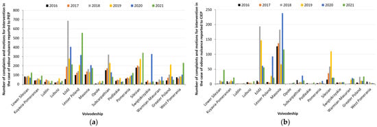 Currently in Poland, complaints and requests for intervention in the field of air protection and odour nuisance can be submitted at the provincial level to the Provincial Inspectorate of Environmental Protection (PIEP) and at the national level to the Chief Inspectorate of Environmental Protection (CIEP). An analysis of data from 2016 to 2021 covering the number of all complaints and requests for intervention by one of the above-mentioned Environmental Inspectorates shows that the number of handled cases for both air protection and odour nuisance is increasing from year to year (Figure 4).